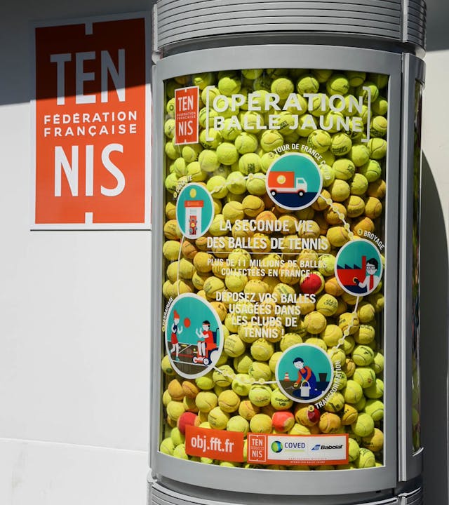 Action phare de la FFT en matière de développement durable, l’Opération Balle Jaune permet de recycler les balles de tennis usagées depuis 2009. En 2023, la FFT renforce son engagement pour donner une seconde vie à encore plus de produits résultant de ses disciplines avec la collecte du matériel sportif.